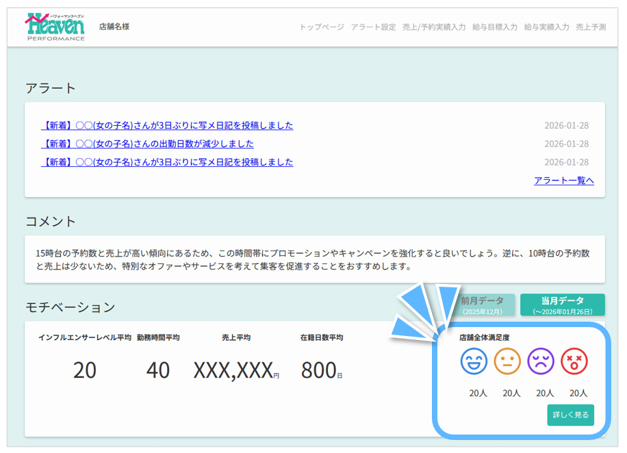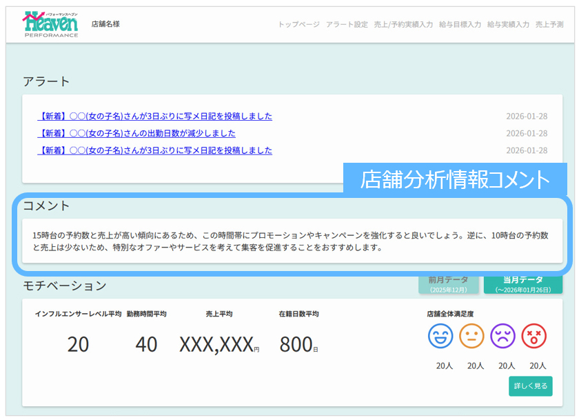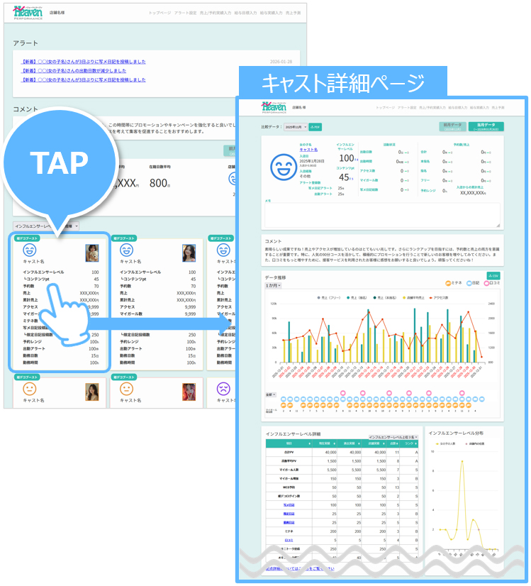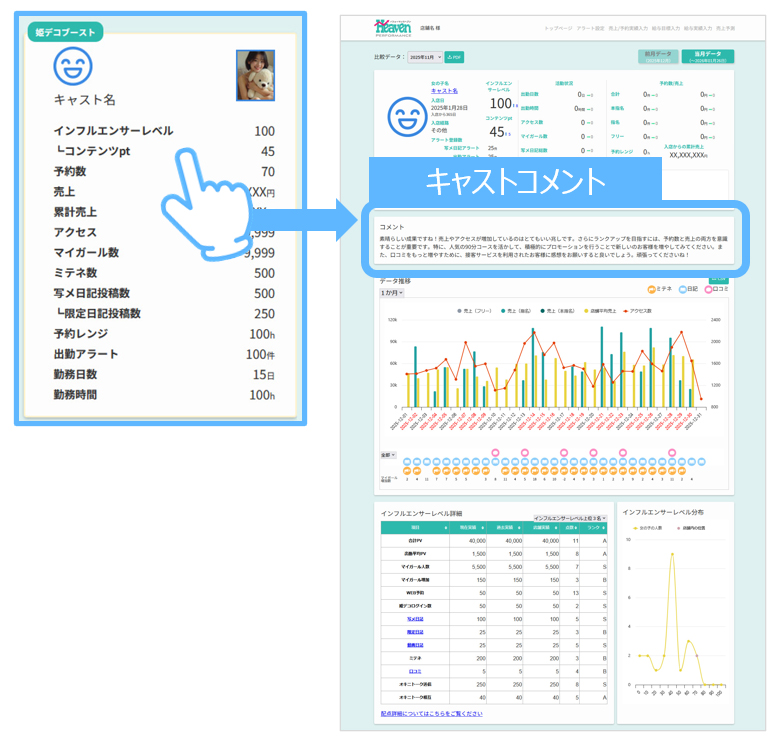 ヘブンネットの持つ豊富なデータを用い、『コンテンツ活用』・『キャストのモチベーション(満足度)』・『アクセス数』などの多方面からお店のマネジメントをサポートするツールです。