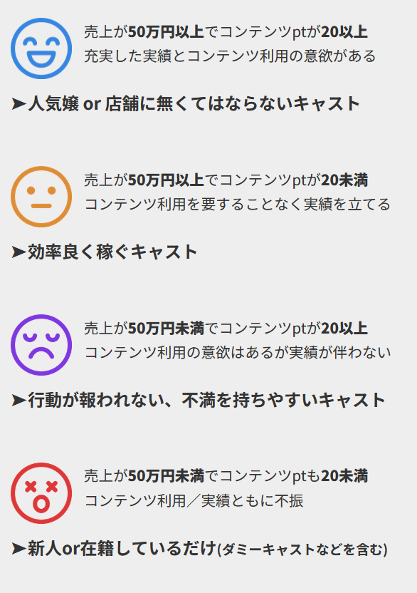 店舗に在籍するキャストのモチベーション、4種類の顔で分類します。