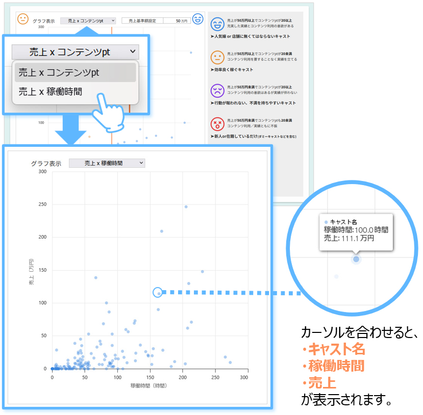 グラフ表示のプルダウンから[売上×稼働時間]に切り替えることで、キャストの稼働時間に対する売り上げを見ることができます。