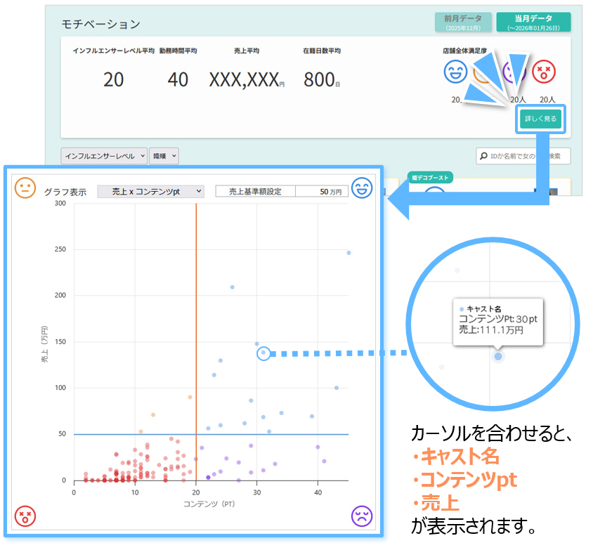 キャストのコンテンツ活用に対してのキャストの売上を見ることができ、店舗からキャストへの働きかけを行うための基準となります。