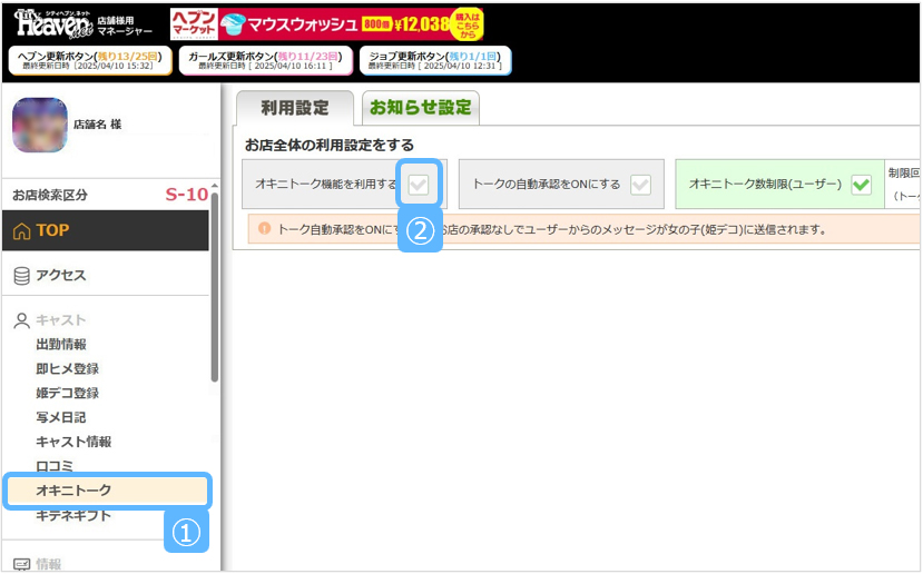 トーク自動承認をONにすると、ユーザーから届いたトークをお店様の承認操作なしでキャスト(姫デコ)に送信します。