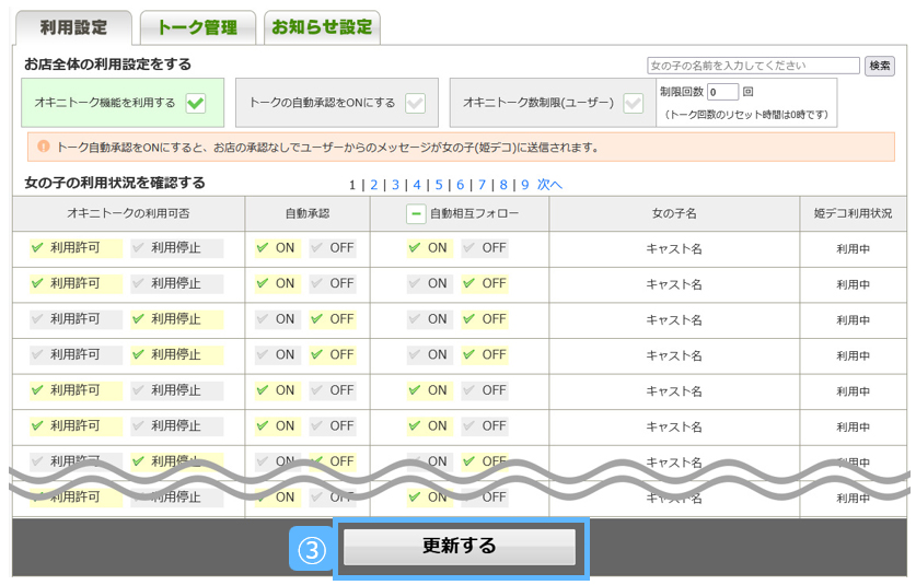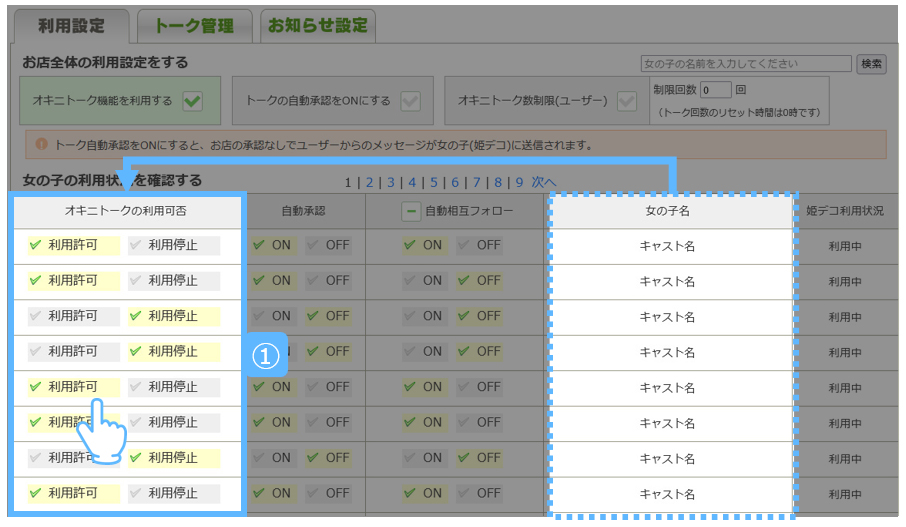 ①.オキニトークを利用してほしいキャストのみ[利用許可]を選択します。