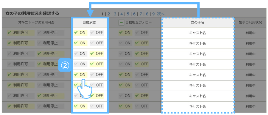 ②.トークの自動承認をするキャストのみ、自動承認を[ON]にします。