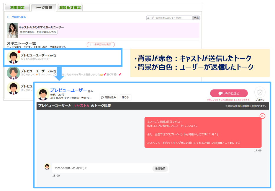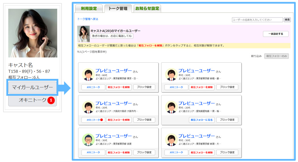 [トーク管理]を押すと、オキニトークを利用しているキャストが一覧で表示されます。