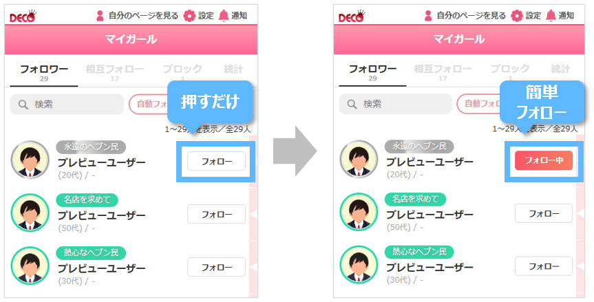 マイガール登録(フォロー)してくれているユーザーをキャストがフォローすることで、姫デコからメッセージが送信できる機能です。