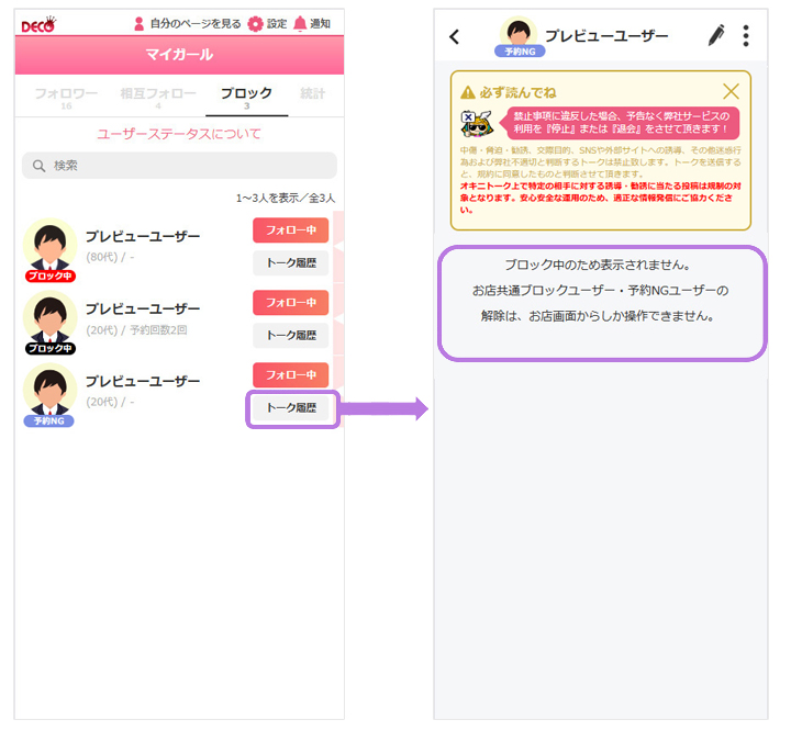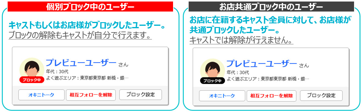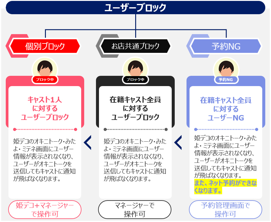 お店様もしくはキャストが悪質だと判断したユーザーに制限をかけられる機能を指します。