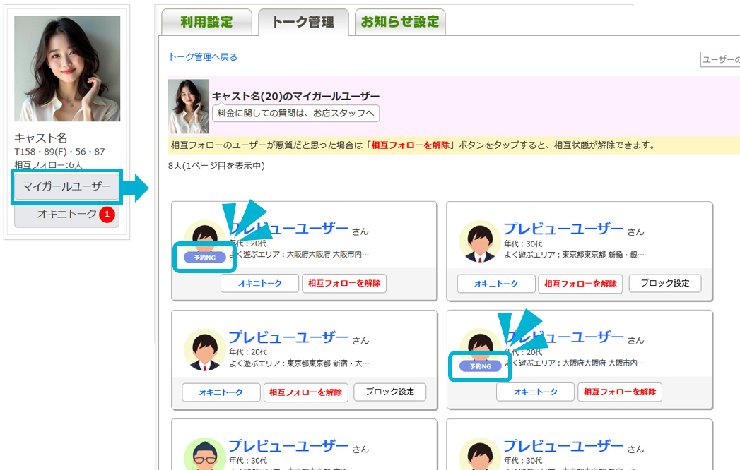 予約のNG設定にもキャスト個別NGやお店共通NGがありますが、オキニトークの画面では全て『予約NG』として表示されます。