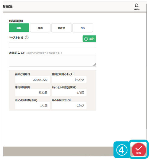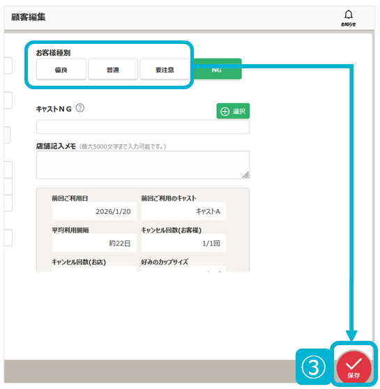 ③.お客様種別で、NG以外の任意のステータスを選択⇒[保存]を押して完了です。