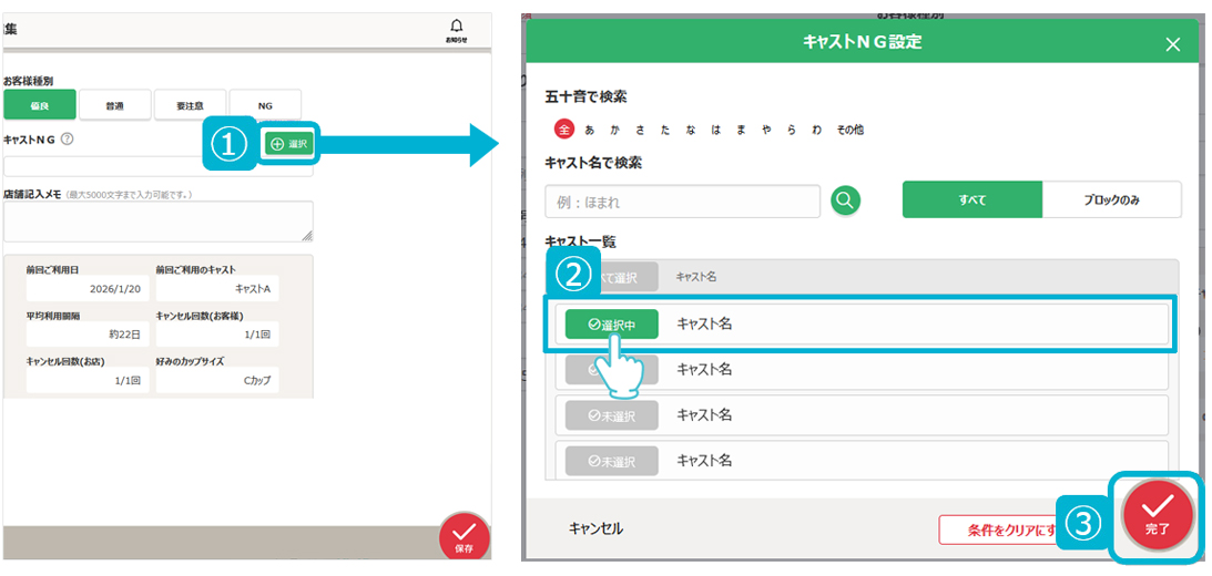 ①.顧客台帳からユーザー編集ページに入り、キャストNG欄の[選択]を押します。