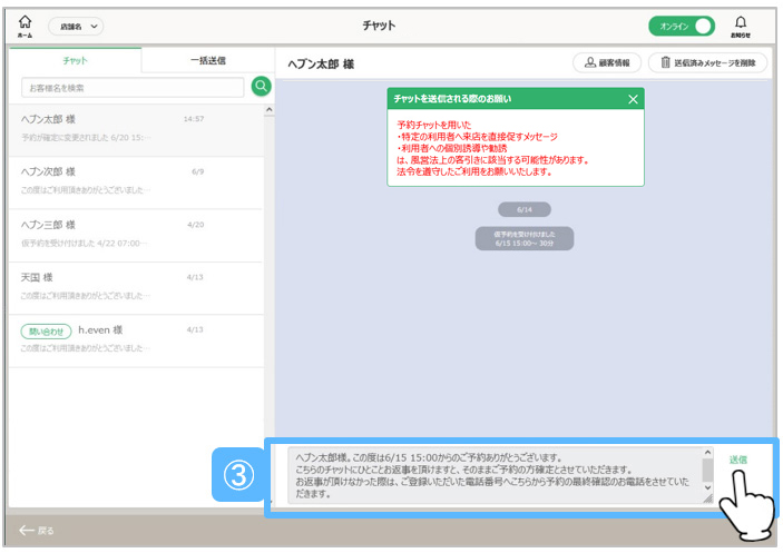 ③.本文を入力⇒[送信]を押すことでユーザーにチャットを送ることができます。
