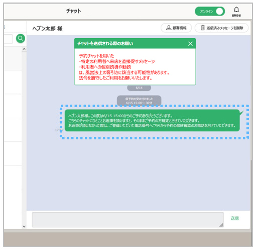 ネット予約をしたユーザーが、ここからお店にチャットで問い合わせをすることができます。