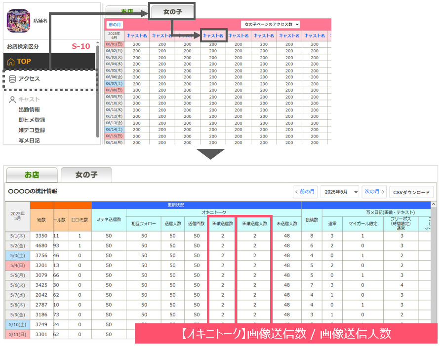 ・キャストがオキニトークで画像を送信すると、キャストごとの統計情報画面に『画像送信数』と『画像送信人数』にも反映されます。
