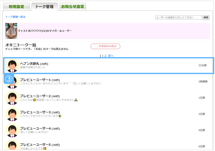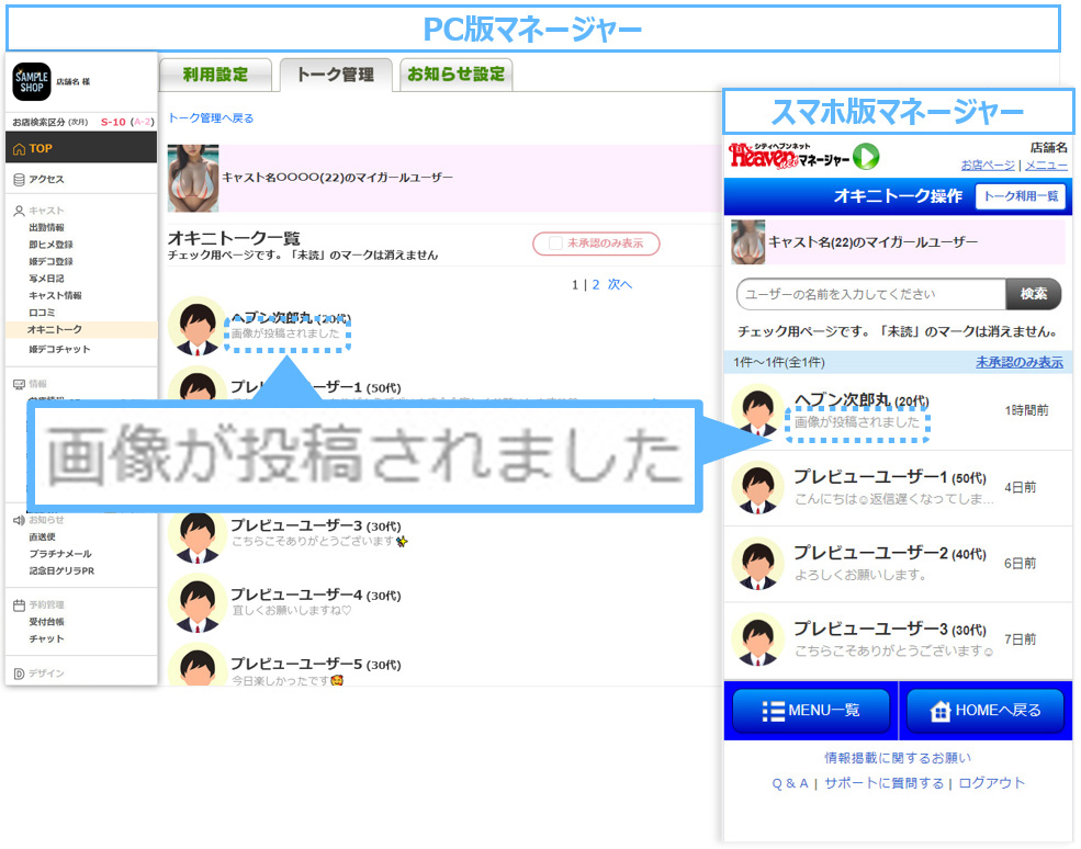 キャストが姫デコのオキニトークから画像を送信するとマネージャー画面にも表示がでます。