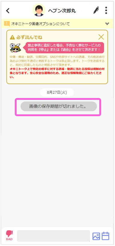 画像が非表示になった後のトーク画面には、「画像の保存期間が切れました。」と表示されます。