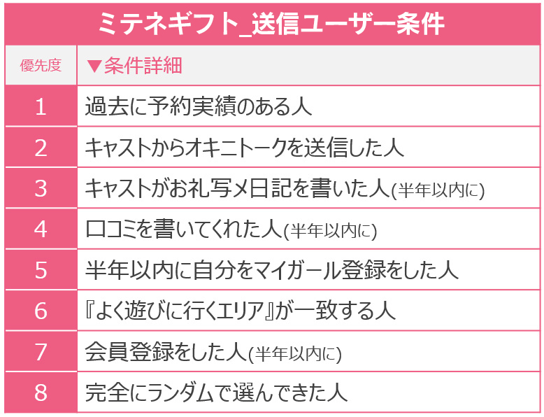 該当者が50人(ミテネギフトの送信回数)に満たない場合は、残りの人数を優先条件2『キャストからオキニトークを送信した人』から選出します。