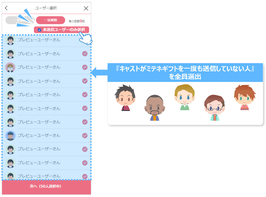 ユーザー選択画面に表示されたユーザーの中から、更に『一度もミテネギフトを送信したことがないユーザー』をピックアップして自動で選択します。