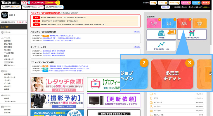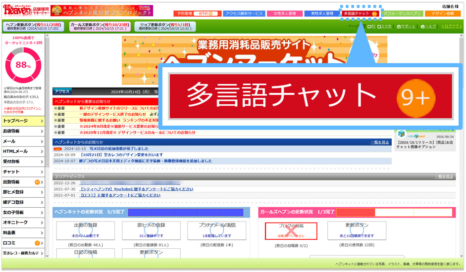 男性求人管理とパフォーマンスヘブンのボタンの間に『多言語チャット』ボタンを追加。その、ボタン内に未読件数が表示されます。