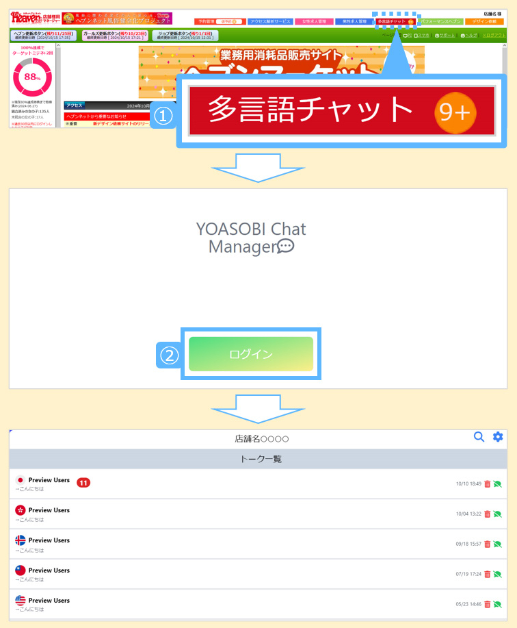 2024.10.22(火)ヘブンネットのPCマネージャー画面に、YOASOBI HEAVENの機能である『多言語チャット』の未読チャット件数を表示します。