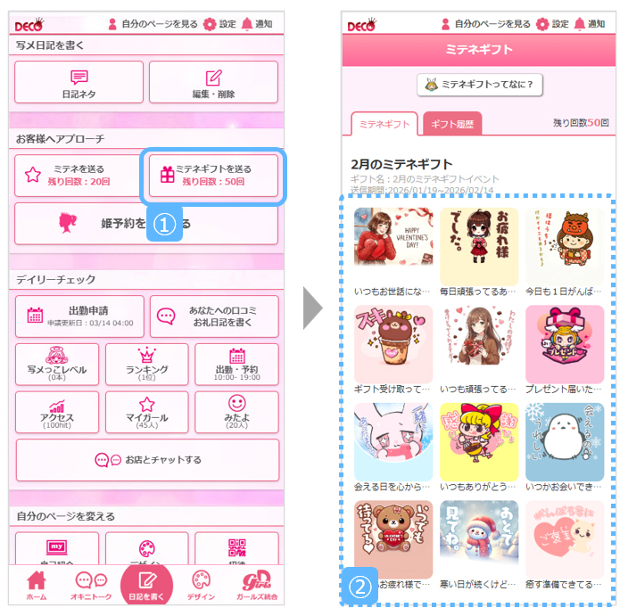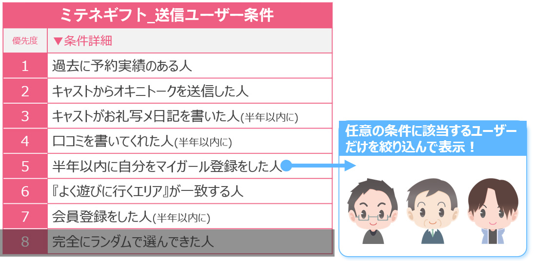 該当者が50人(ミテネギフトの送信回数)に満たない場合は、残りの人数を優先条件2『キャストからオキニトークを送信した人』から選出します。