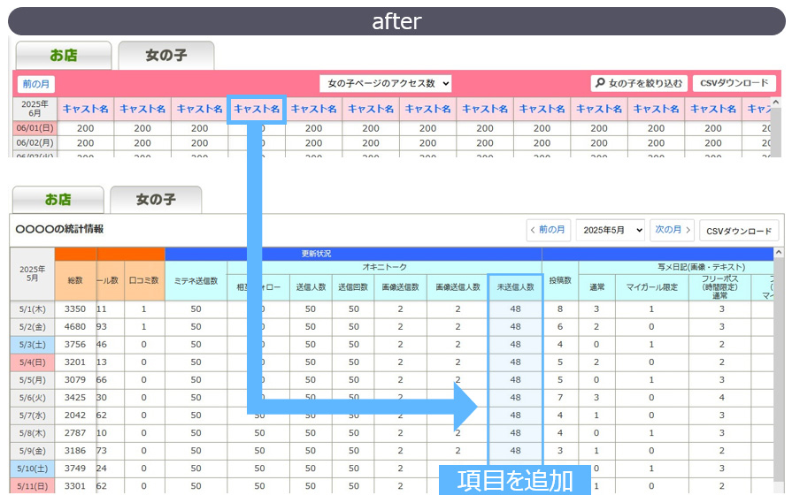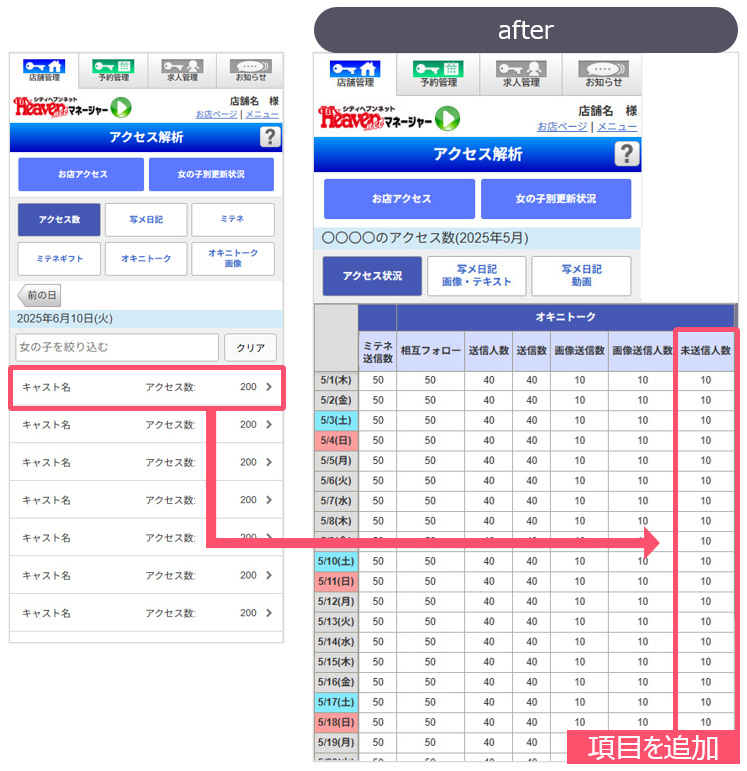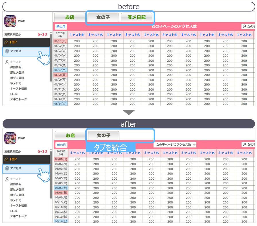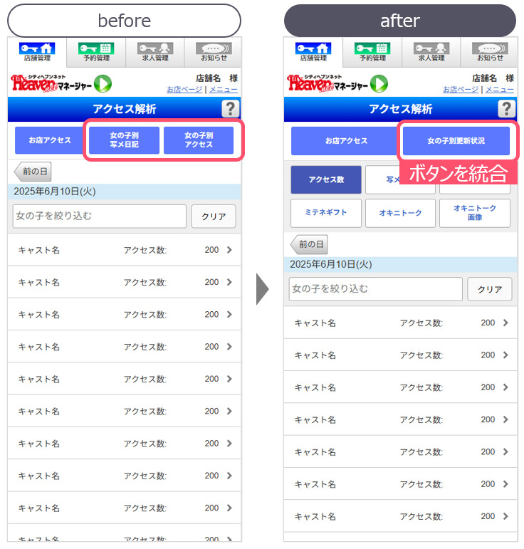 【女の子別写メ日記】と【女の子別アクセス】というボタンを合体し、【女の子別更新状況】というボタンに変更します。