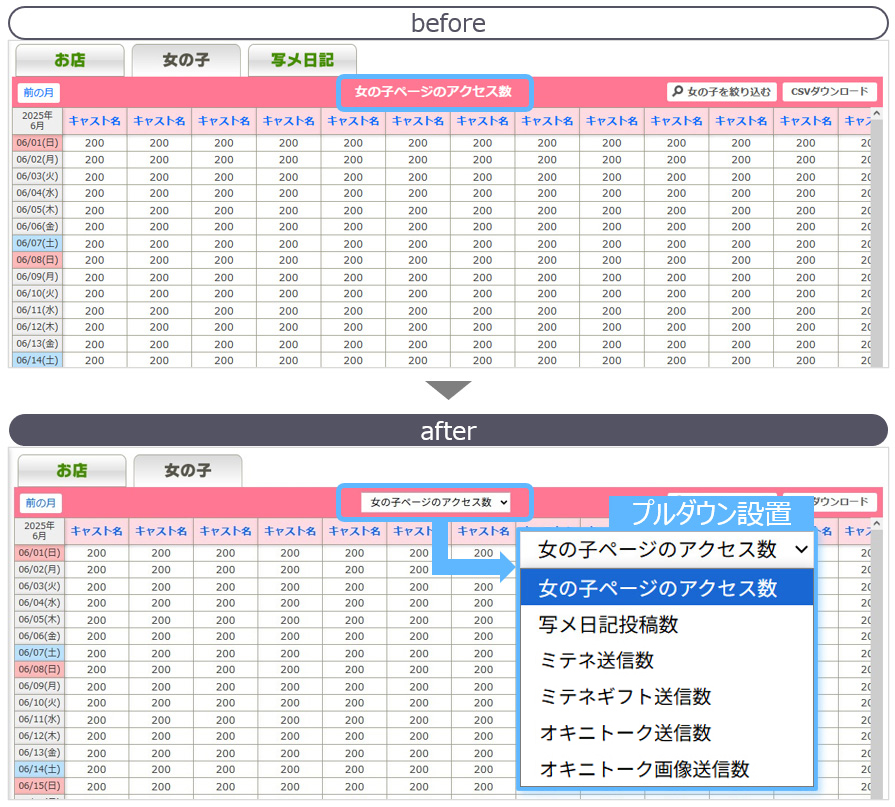 タイトル部分にプルダウンを設置。プルダウン内の項目を選択することで、女の子アクセス画面に表示する内容を切り替えられます。