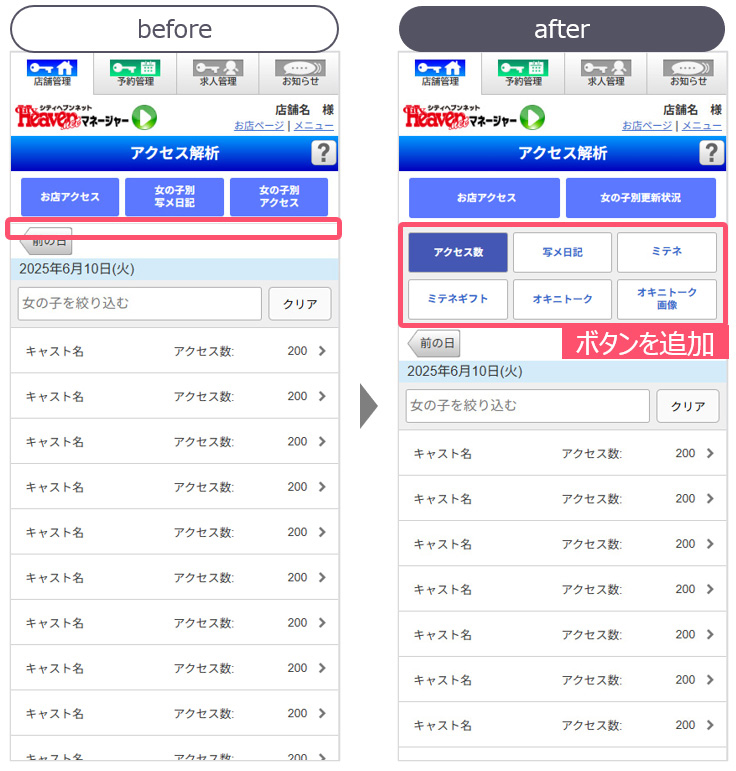女の子アクセス(女の子別更新状況)画面で表示できる項目のボタンを設置。押下することで表示する内容を切り替えられます。