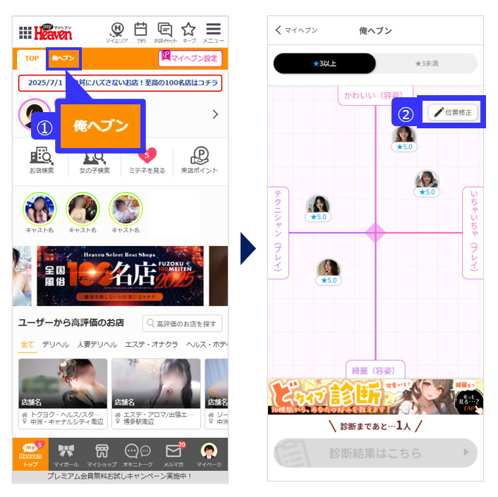 ①.マイヘブントップの上部にある[俺ヘブン]を押します。