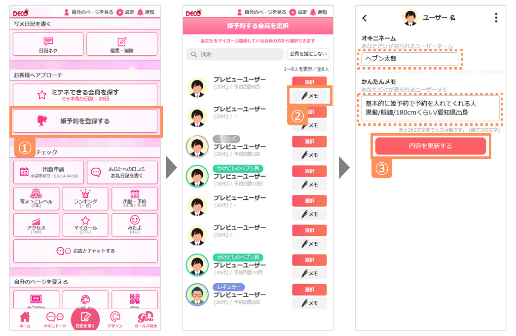 姫デコだけに表示されるキャスト専用のメモ機能です。ユーザー側の画面にもお店画面にも表示されません。