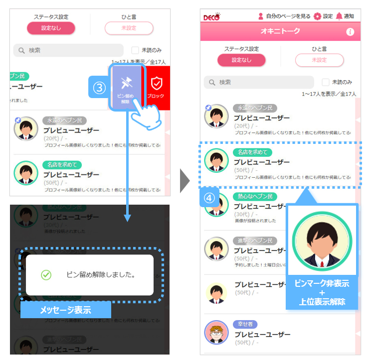 お店様が以下の操作を行うと、ピン留めが解除されます。