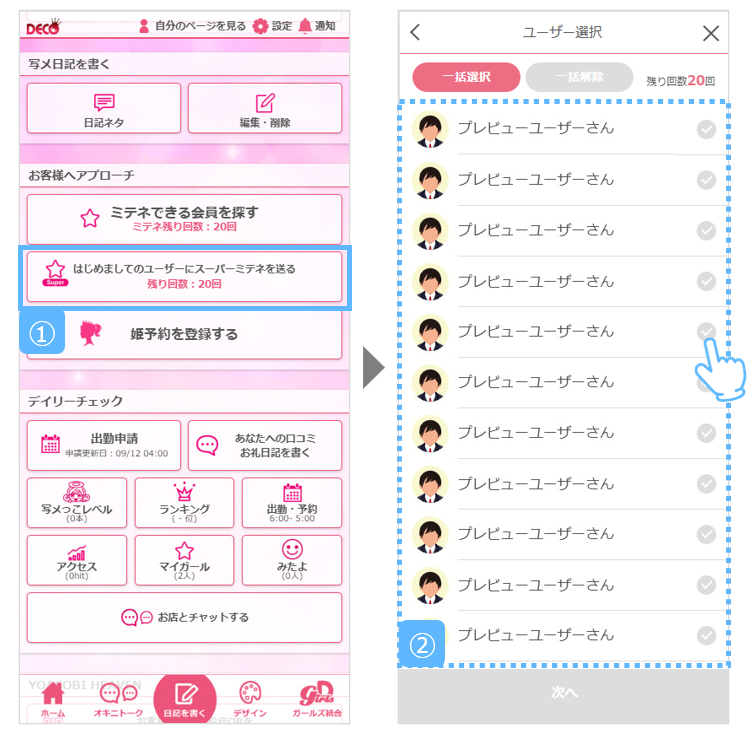 ①.姫デコトップにある[はじめましてのユーザーにスーパーミテネを送る]を押します。