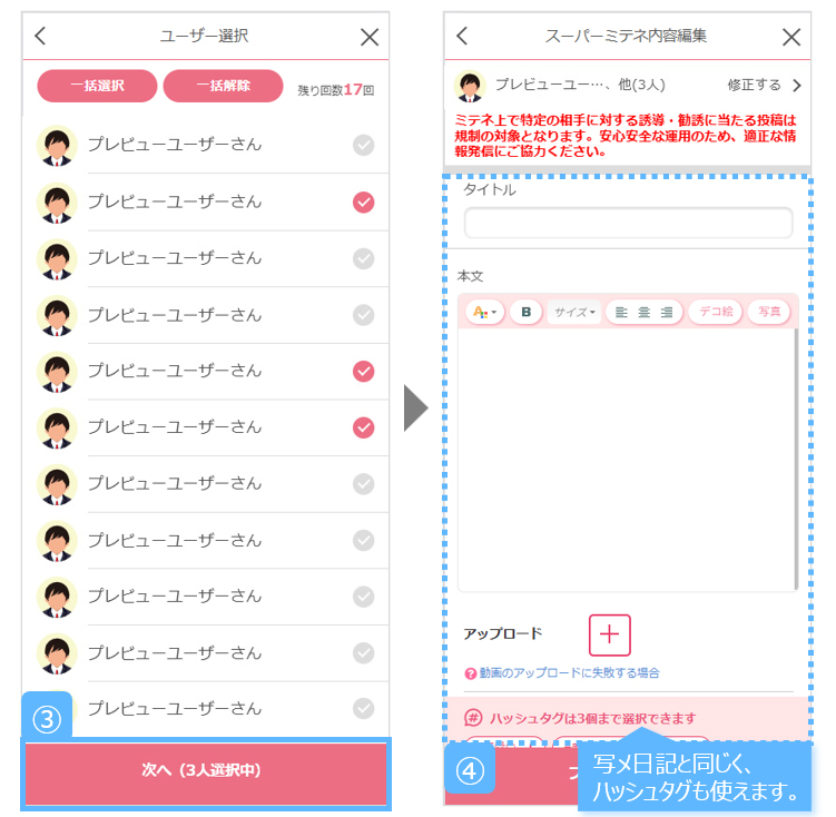 通常のミテネとは異なり『任意の画像や動画を添付できる』ほか、『ユーザーの一括選択』や『写メ日記画面への同時投稿』が可能です。
