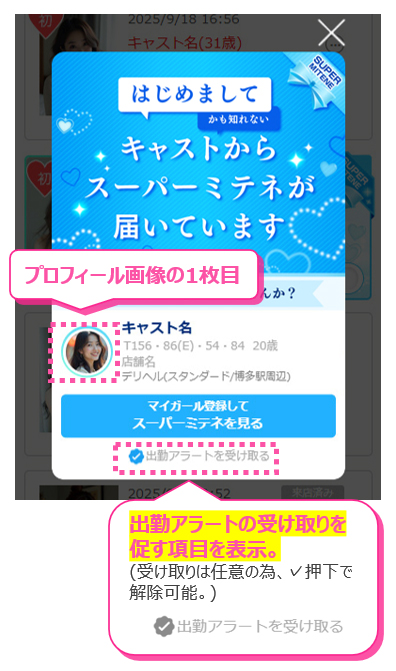 チェックを入れたまま[マイガール登録してスーパーミテネを見る]を押すと、そのキャストの出勤アラートを受け取る状態になります。