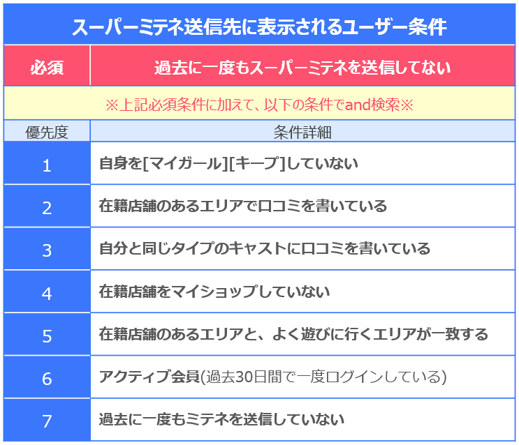 該当者が50人(スーパーミテネの送信回数)に満たない場合は、残りの人数を『優先度の高い条件を満たしているユーザー』から選出します。