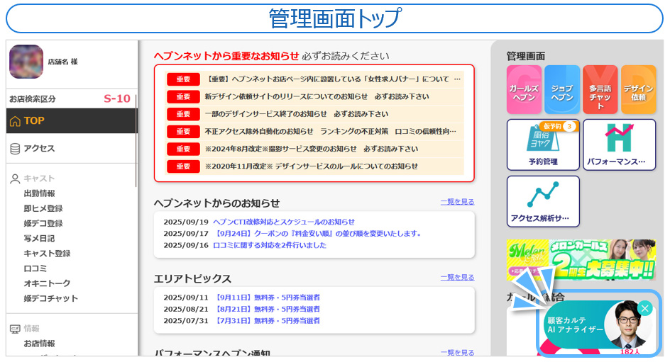管理画面の右下にある[顧客カルテ AIアナライザー]を押して起動します。(顧客カルテ画面から起動しても、性能は変わりません。)