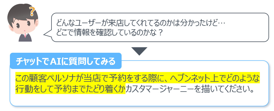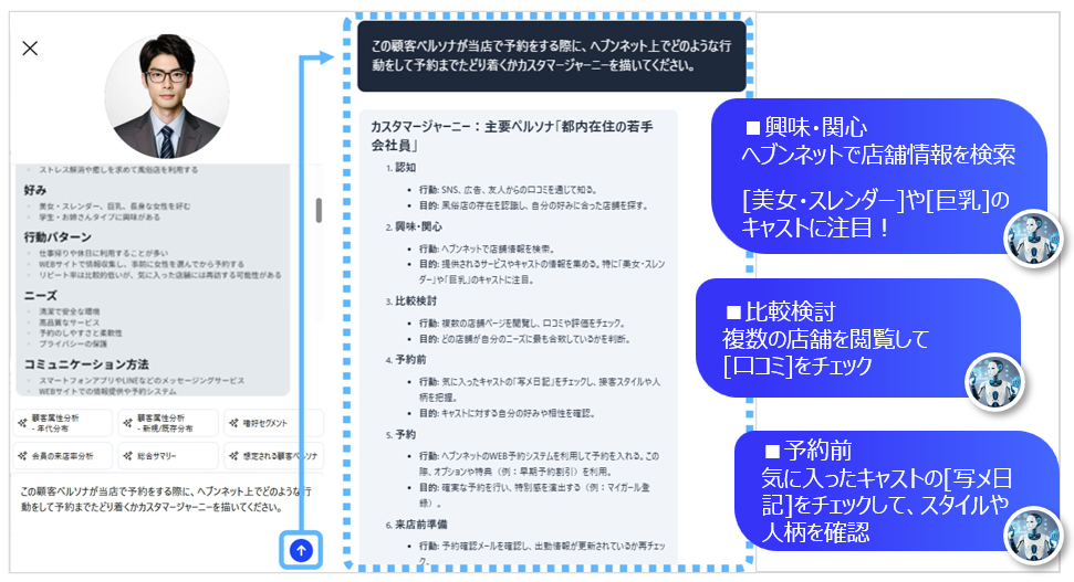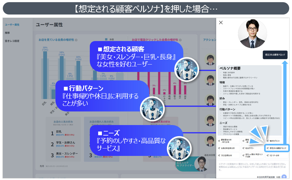 [想定される顧客ペルソナ]のボタンを押すと、AIがユーザーの行動・嗜好などから自動で分析し、文章で回答します。