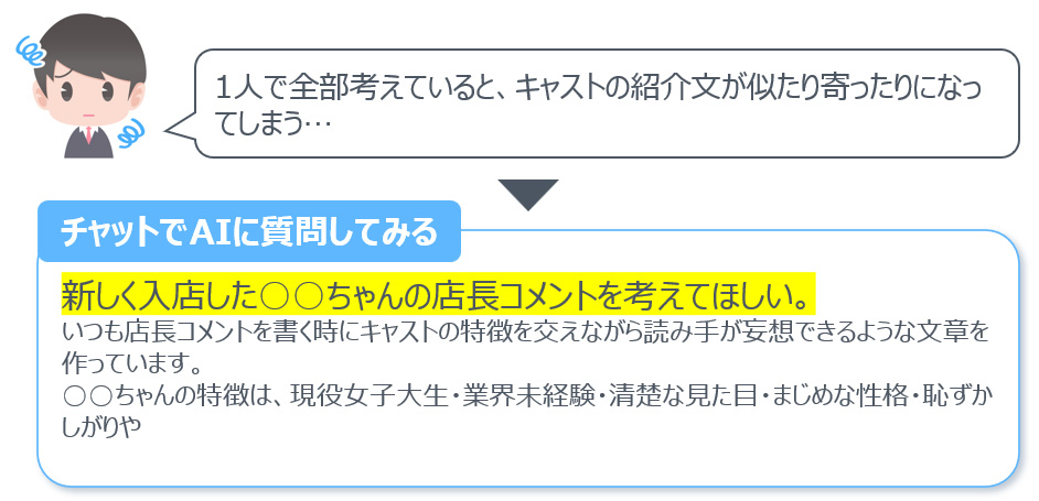 データ分析だけでなく、キャストのコメント作成や告知文のアイデア出しなど、日々の業務もAIに相談して時短できます。