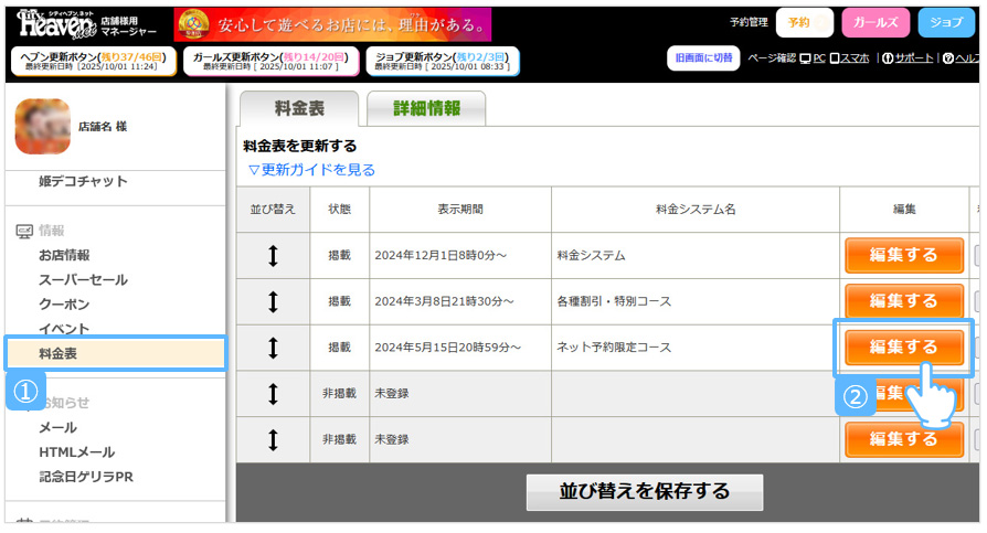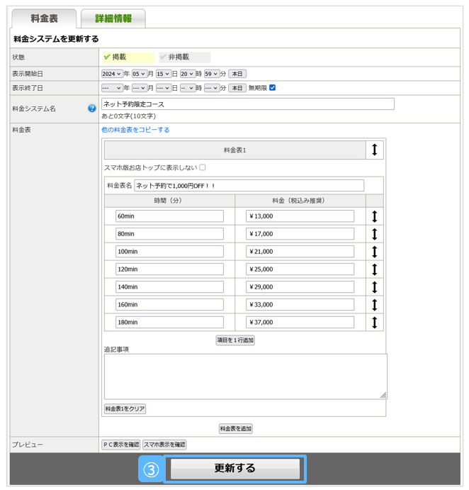 料金表の表示/非表示の切り替えおよび、内容の編集はPC版のマネージャーから操作を行ってください。