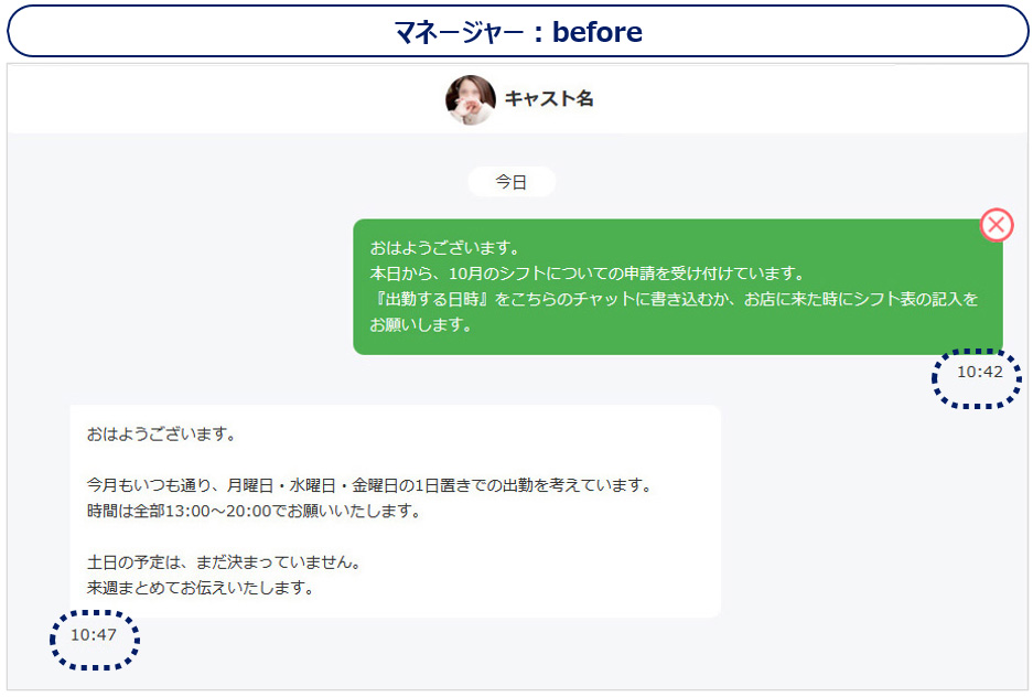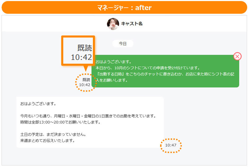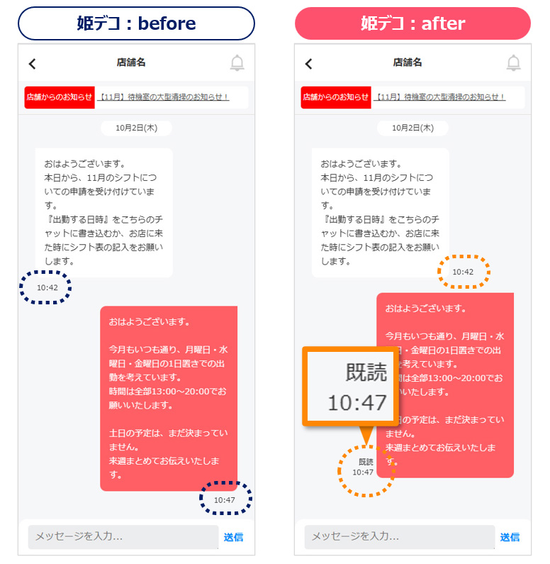 お店様やキャストが、チャットを確認した際に『既読』文言を表示します。