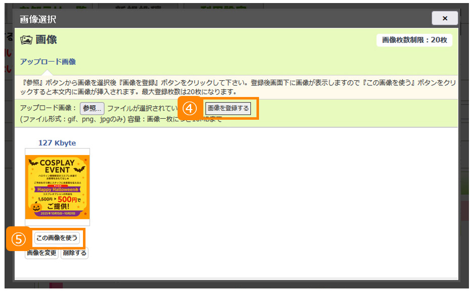 ④.[画像を登録する]を押して、画像をアップロードします。(画像登録枚数:20枚まで)
