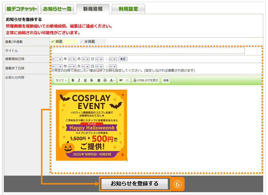 ⑥.タイトルや掲載開始日などの必要事項を入力⇒[お知らせを登録する]を押して、投稿します。