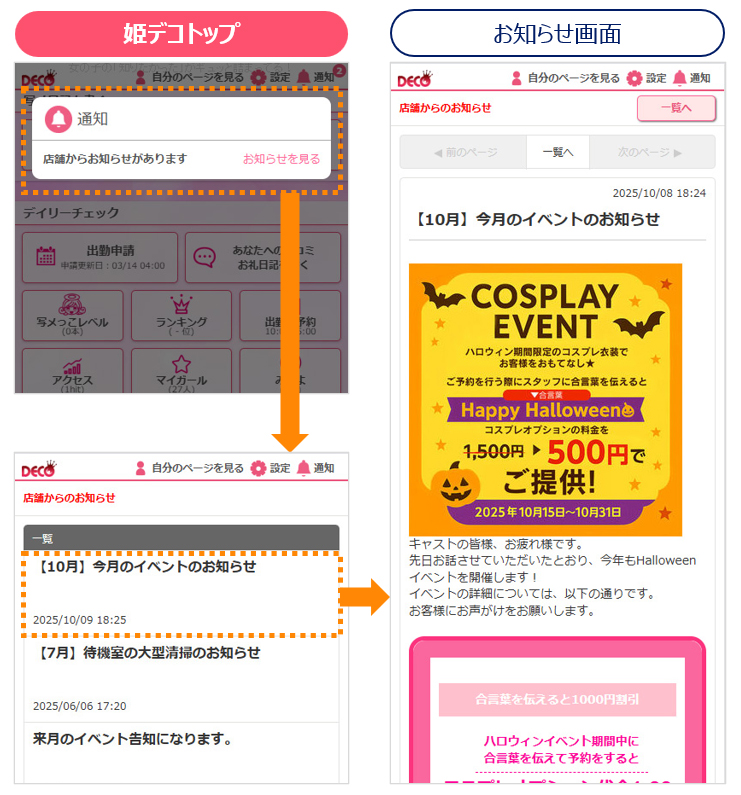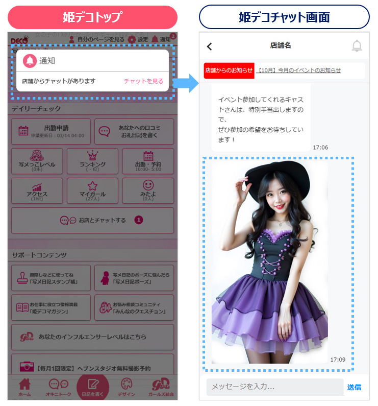 姫デコチャットの利用状況をOFFにしたキャストは、お知らせ機能(お知らせの受け取り)も利用できなくなりますのでご注意ください。