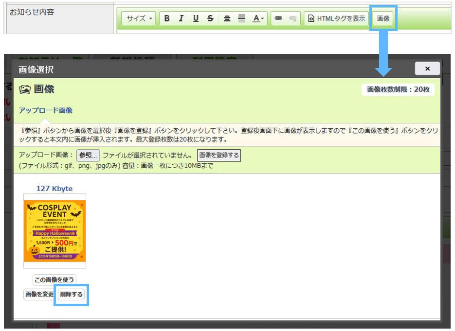 お知らせ編集画面もしくは新規投稿画面から、[画像]を押す⇒任意の画像の[削除する]⇒[OK]を押すことで削除できます。