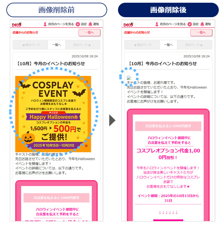 お知らせ本文内に使用している画像を削除すると、送信済みのお知らせの画像も表示されなくなりますのでご注意ください。