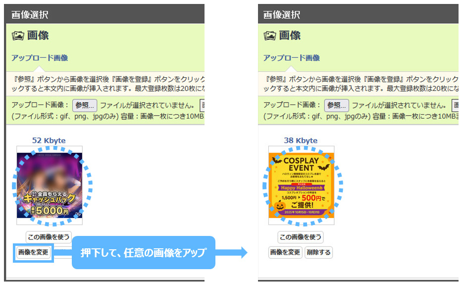 [画像を変更]ボタンを使って画像を差し替えると、既に投稿したお知らせにも反映されますか?
