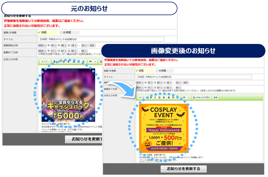 『投稿したお知らせ』にも『未投稿のお知らせ』にも、同じ画像を使用している場合はすべて反映されます。