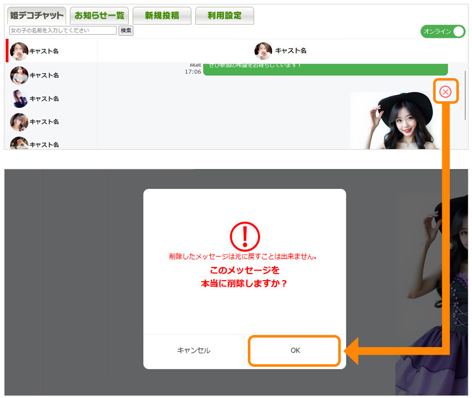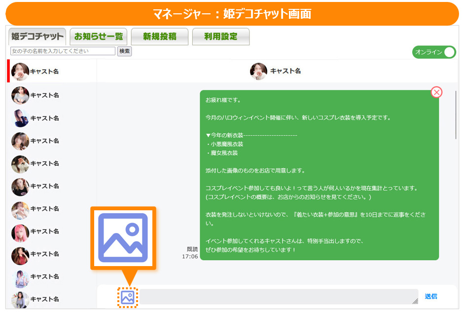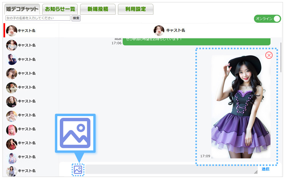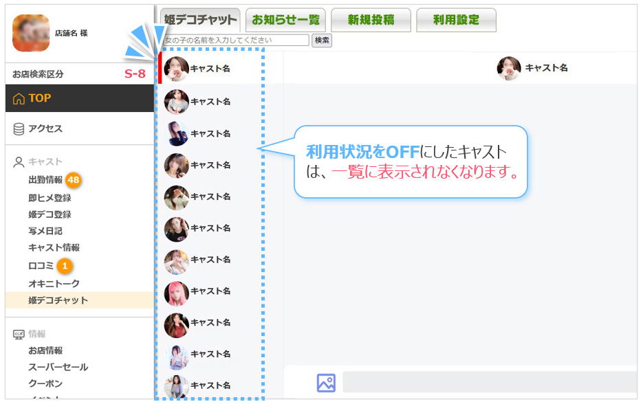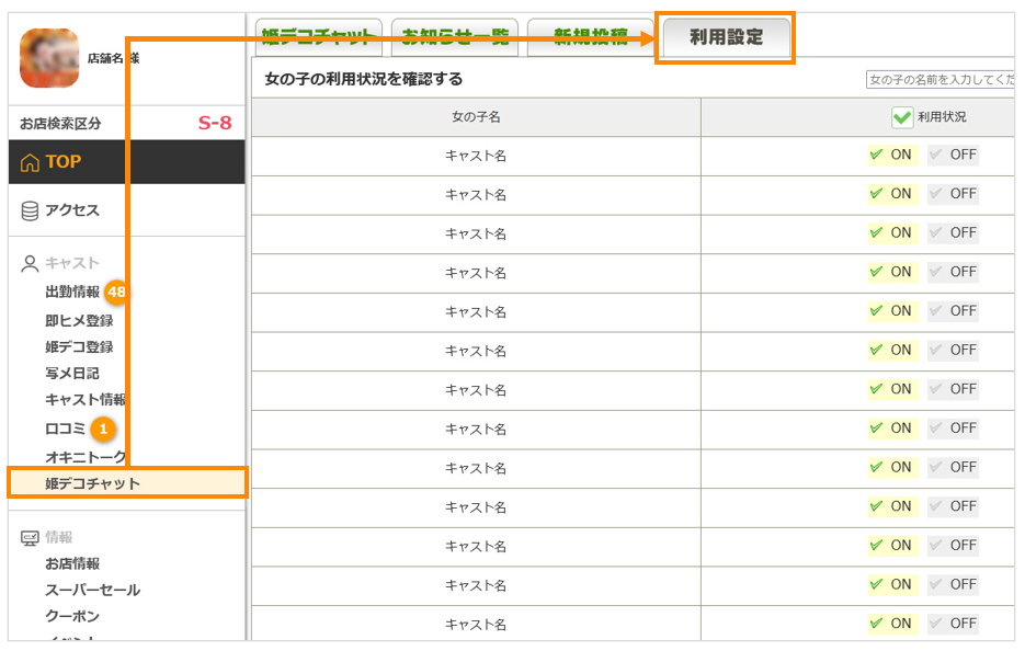 姫デコチャットを利用できるキャストを、お店様で設定できます。