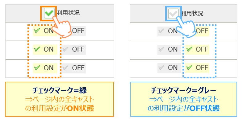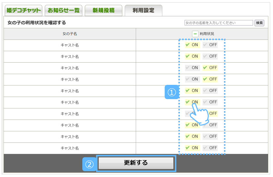 ①.姫デコチャットを使わせたいキャストのみ、利用状況を[ON]にします。