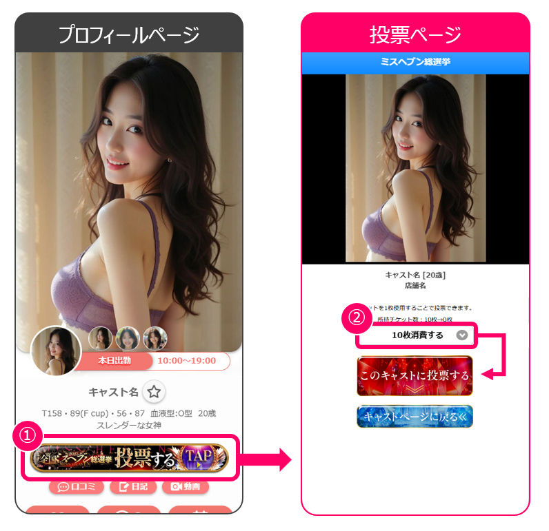 ②.投票するチケット枚数を選択⇒[このキャストに投票する]を押すことでチケット消費と同時に投票が完了します。