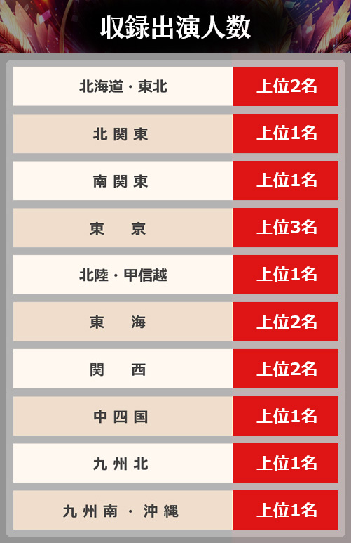 地方予選を勝ち抜いたキャストの中から、ブロックごとのランキングを決めます。