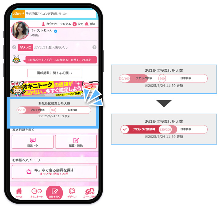 ▼姫デコ画面でも、キャストが自身の投票人数の進捗を確認することができます。